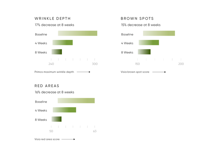 The usual signs of skin ageing: wrinkle volume, brown spots, UV spots and visible pores showed significant decreases. While that feature of younger skin, elasticity, actually increased. At the same time as signs of ageing decreased, the serum also calmed the skin, with red areas and blemishes decreasing significantly.